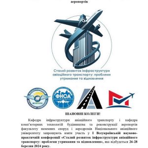 28-29 лютого 2024 року у змішаному форматі відбувся Міжнародний науково-практичний семінар «Застосування цементобетонів при відновленні інфраструктури», який організований співробітниками Державного підприємства «Дорожній науково-технічний центр» та Державного агентства відновлення та розвитку інфраструктури України. До участі у семінарі долучилися науково-педагогічні працівники кафедри інфраструктури авіаційного транспорту Факультету наземних споруд і аеродромів Національного авіаційного...
